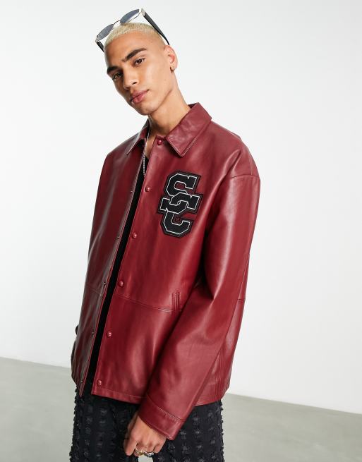 ASOS DESIGN oversized real leather varsity harrington jacket in burgundy