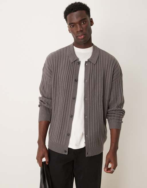 ASOS DESIGN oversized ribbed knitted cardigan with collar in charcoal grey