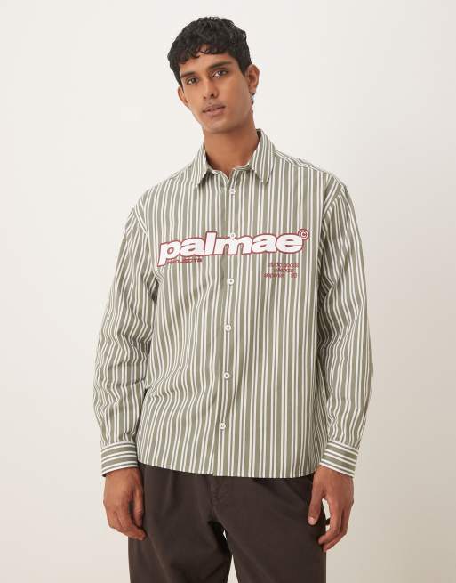 ASOS DESIGN oversized shirt with chest print in green and white stripe