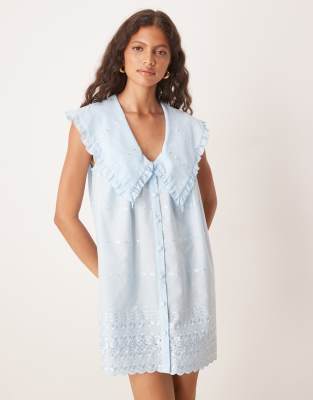 ASOS DESIGN oversized sleeveless collar shirt dress in blue broderie