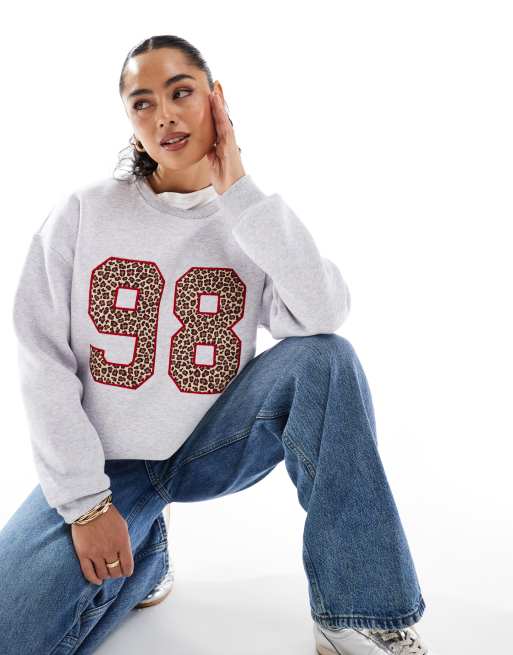 ASOS DESIGN oversized sweat with contrast stitch leopard number applique in grey marl