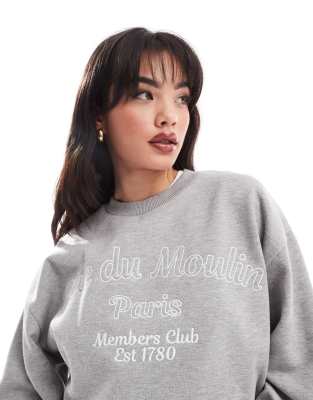 ASOS DESIGN oversized sweat with high build embroidered rue de moulin graphic in grey marl