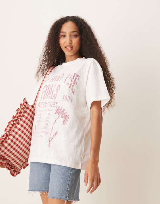 ASOS DESIGN oversized t-shirt with band graphic with lace overlay in white