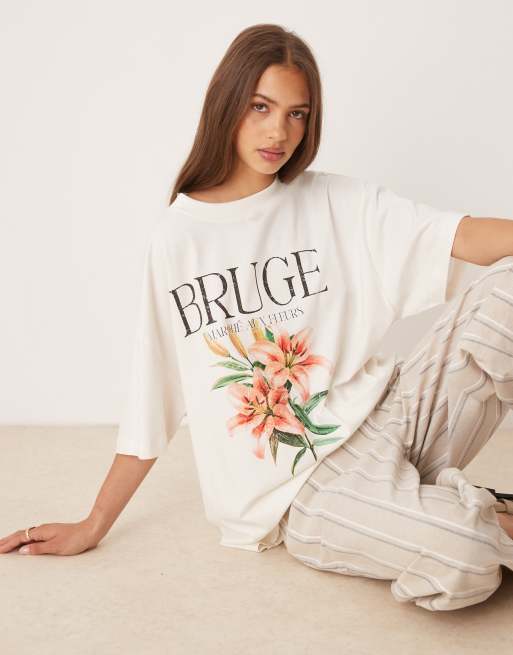 ASOS DESIGN oversized t-shirt with bruge flower graphic in cream