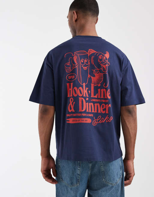 ASOS DESIGN oversized t-shirt with cartoon fish and chips graphic in navy