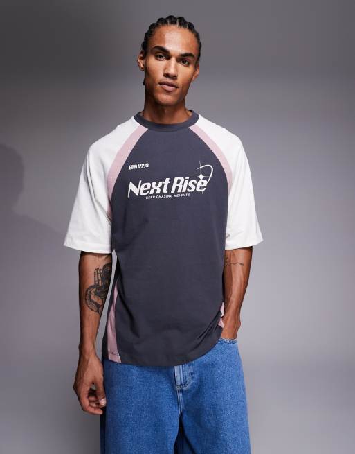 ASOS DESIGN oversized t-shirt with cut and sew panelling and sports graphic in charcoal