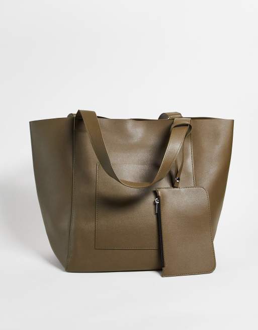 ASOS DESIGN oversized tote bag in khaki faux leather with detachable wallet
