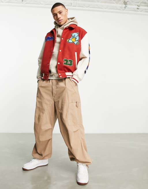 ASOS DESIGN oversized wool look varsity bomber jacket in red