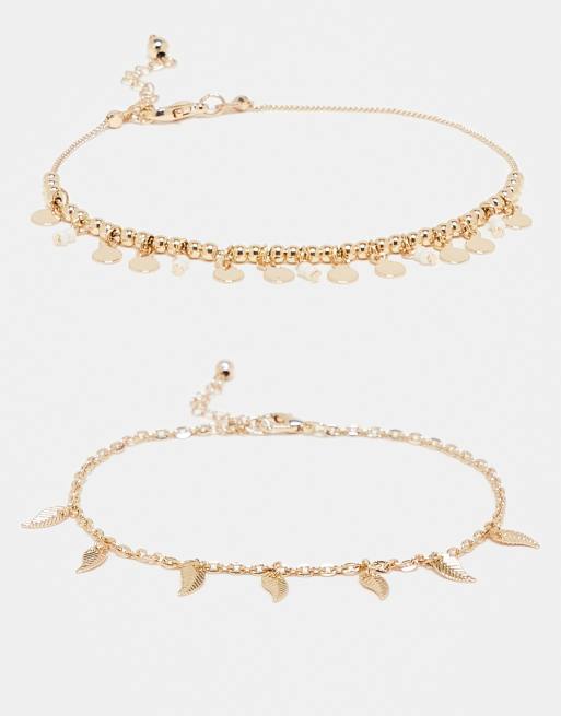 ASOS DESIGN pack of 2 anklets with leaf and charm design in gold tone