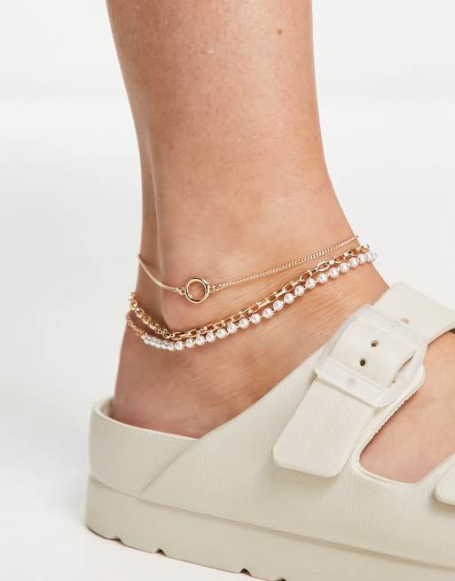 ASOS DESIGN pack of 3 anklets with pearl and mixed chains in gold tone
