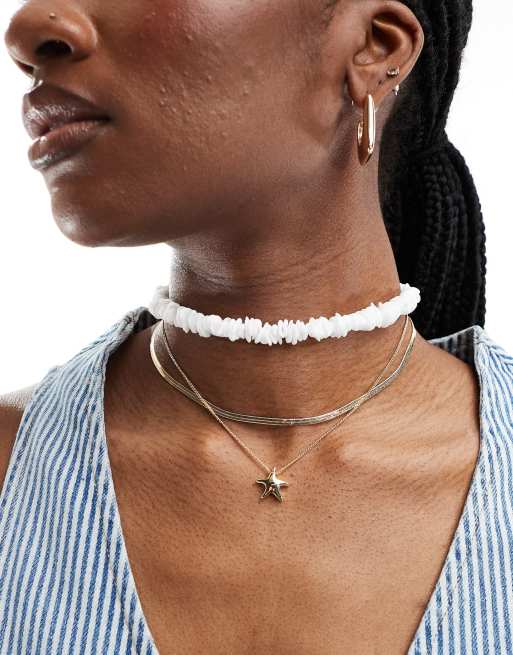 ASOS DESIGN pack of 3 necklaces with faux pearl chippings and starfish charm in gold tone