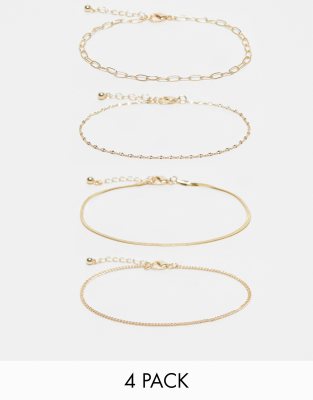 ASOS DESIGN pack of 4 anklets with chain design in gold tone