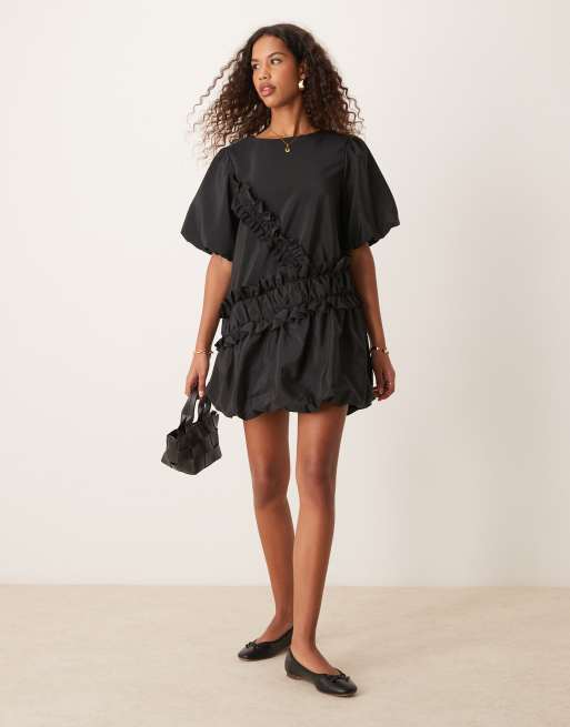 ASOS DESIGN parachute mini smock dress with puffed sleeve & ruffle detail in black
