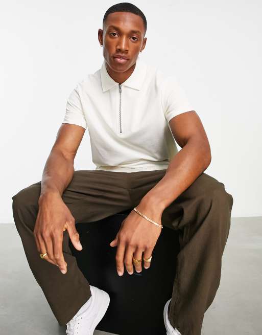 ASOS DESIGN pique polo with zip and rib details in cream