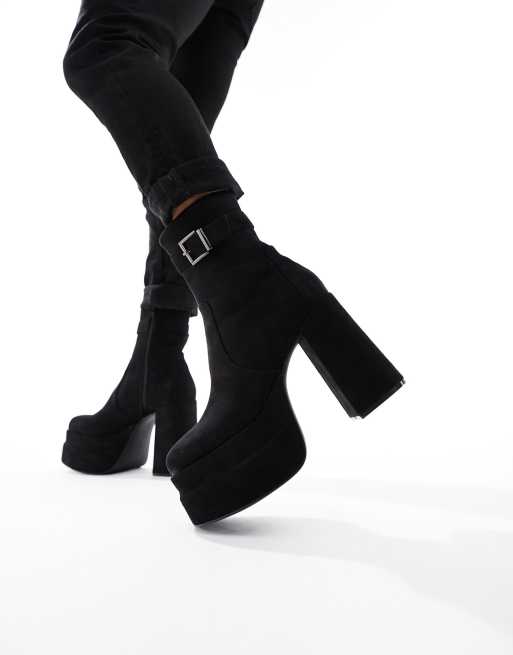 ASOS DESIGN platform heeled boots in black faux suede with buckle detail