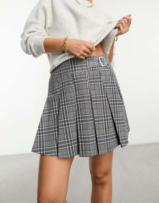 ASOS DESIGN pleated mini kilt skirt with buckle in grey check
