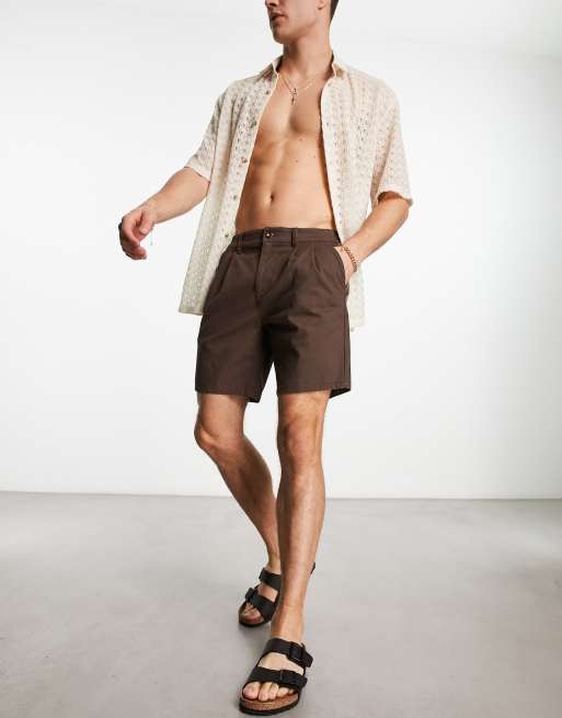 ASOS DESIGN pleated shorts in mid length in brown