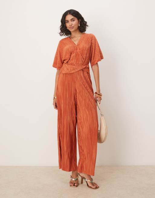 ASOS DESIGN plisse plunge short sleeve wrap waist jumpsuit in rust