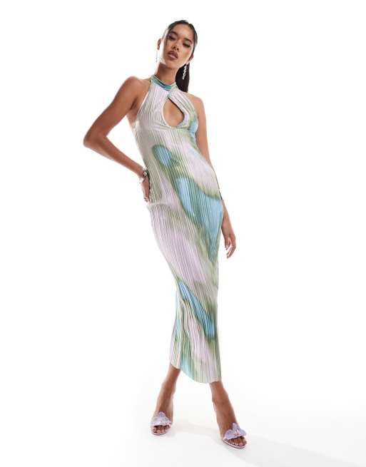 ASOS DESIGN plisse twist neck keyhole midi dress in abstract print