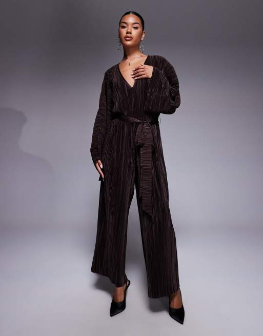 ASOS DESIGN plisse V front tie back waist wide leg jumpsuit in chocolate