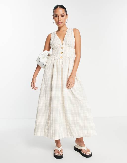 ASOS DESIGN plunge dungaree midi dress in neutral gingham