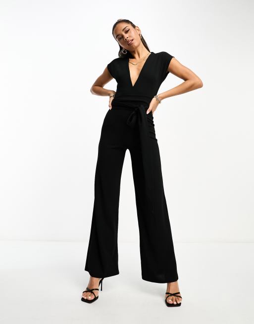 ASOS DESIGN plunge wrap obi tie waist jumpsuit in black