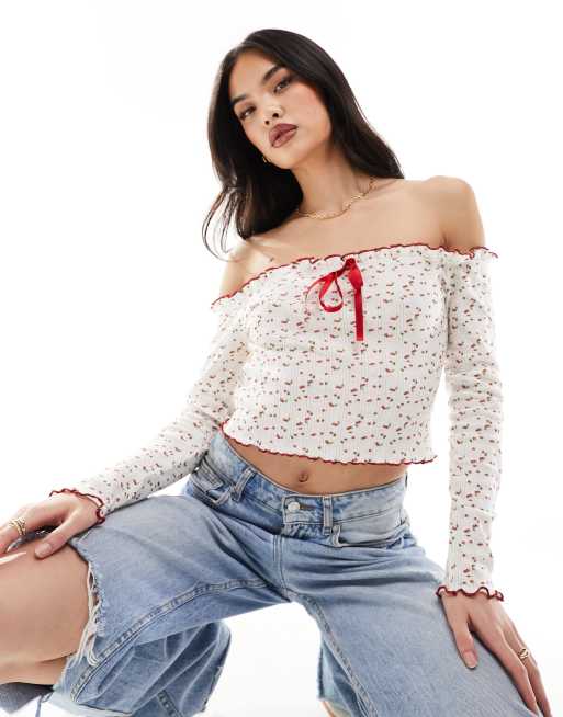 ASOS DESIGN pointelle bardot top with cherry ditsy in ivory