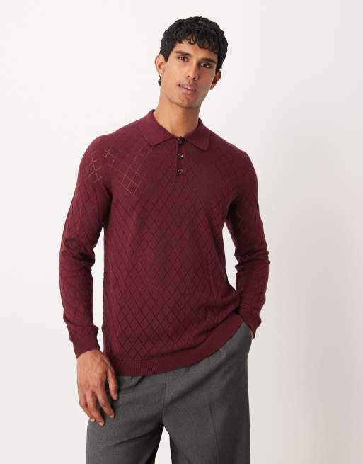 ASOS DESIGN pointelle knitted pattern polo in burgundy