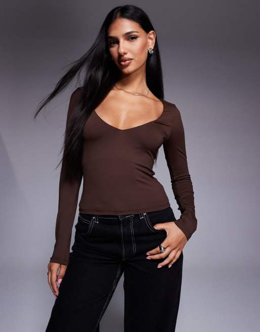 ASOS DESIGN polyamide slinky deep v neck top in chocolate