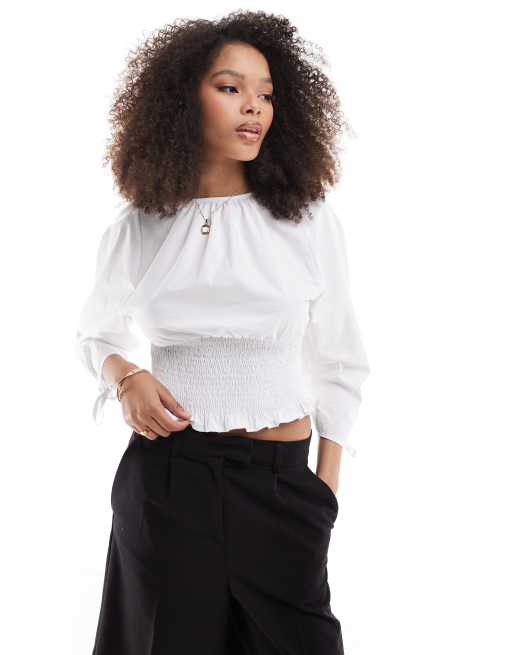 ASOS DESIGN poplin shirred waist ruched sleeve blouse in white