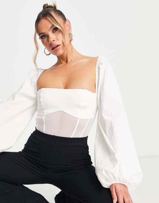 ASOS DESIGN premium corset mesh bodysuit with exaggerated sleeve in white