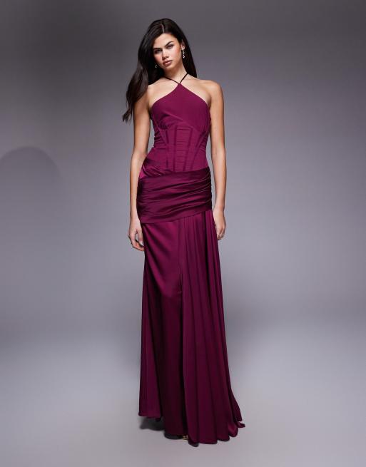 ASOS DESIGN Premium halter fishtail half bow detail and corset maxi dress with train in plum