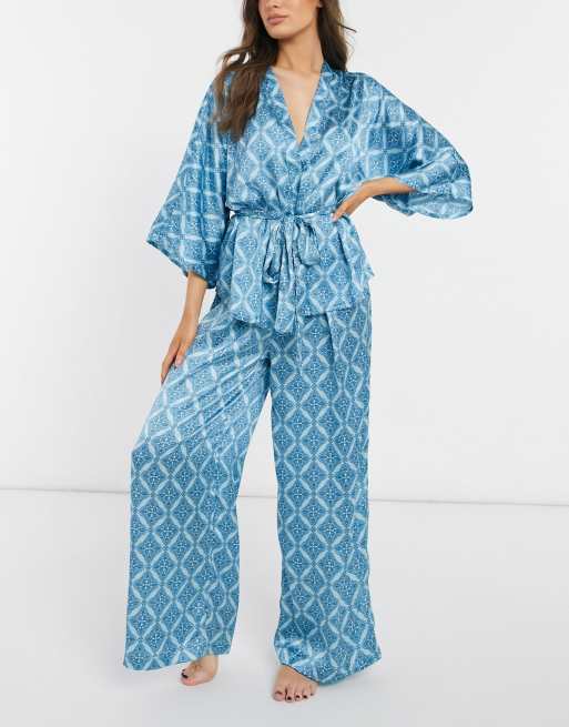 ASOS DESIGN premium tile satin waist tie shirt & trouser pyjama suit set in blue