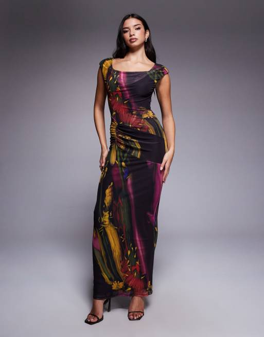 ASOS DESIGN printed mesh cowl drape midi dress with shoulder pad in dark blurred floral
