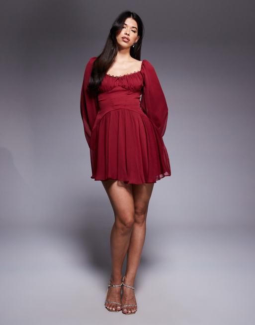ASOS DESIGN puff sleeve chiffon lace up mini skater dress in burgundy