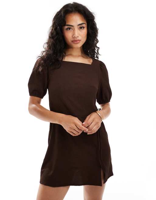 ASOS DESIGN puffed sleeve mini tee dress with tie waist & wrap in coffee