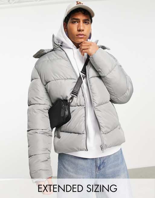 ASOS DESIGN puffer jacket with detachable hood in grey