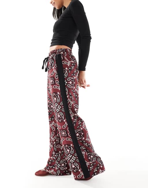ASOS DESIGN pull on trousers with contrast panel in dark cherry bandana print