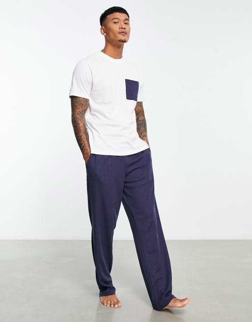 ASOS DESIGN pyjama set in white and navy in waffle texture with t-shirt and trousers
