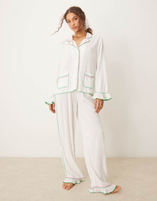 ASOS DESIGN pyjama shirt & trouser set with rik rak trim in white