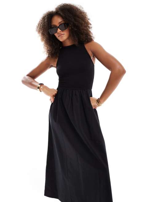 ASOS DESIGN racer crinkle bodice poplin skirt midi dress in black
