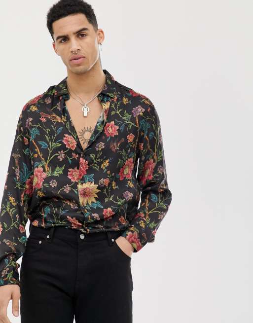 ASOS DESIGN regular fit floral satin shirt in black