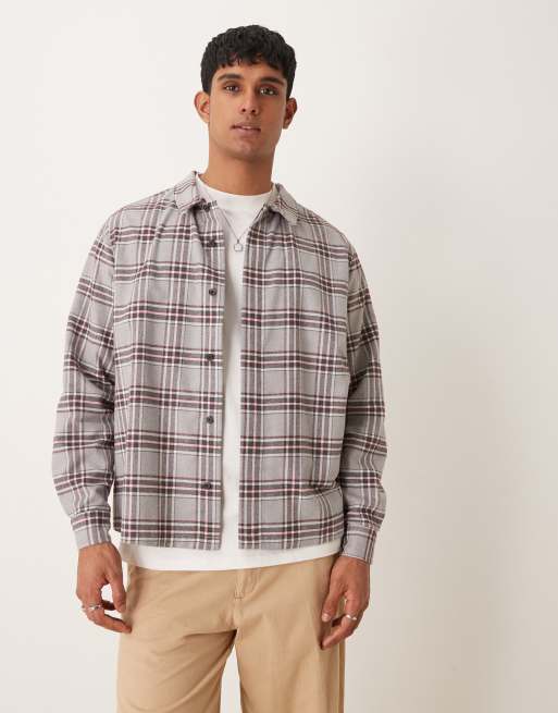 ASOS DESIGN relaxed boxy shirt with brushed check in grey and burgundy