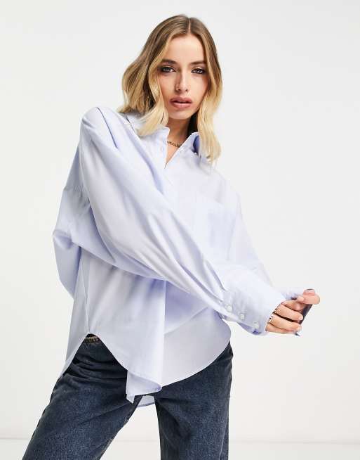 ASOS DESIGN relaxed dad shirt with dipped hem in chambray blue