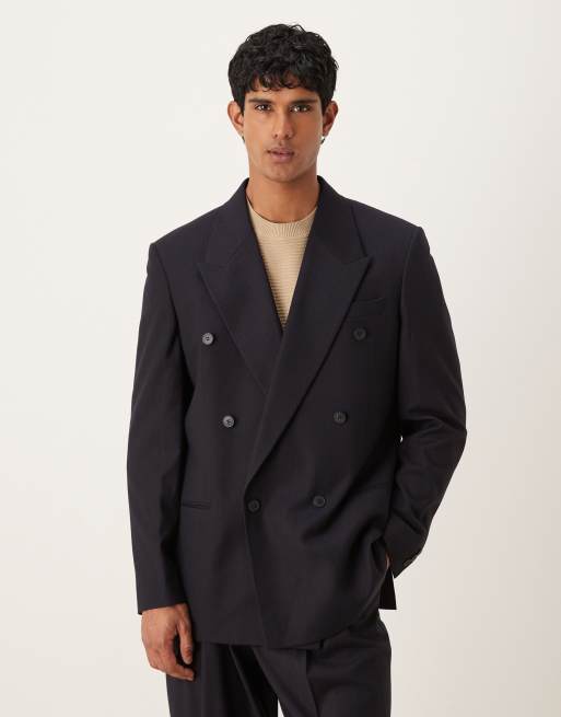 ASOS DESIGN relaxed double breasted jacket with subtle woven stripe in navy