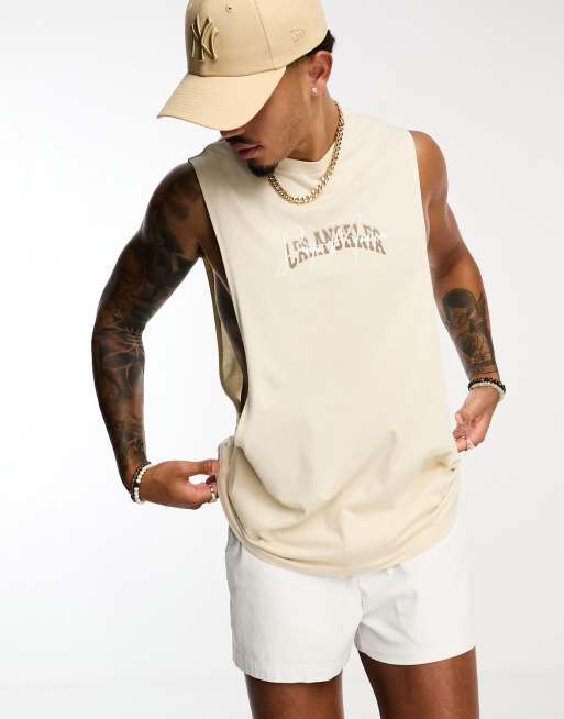 ASOS DESIGN relaxed fit vest in beige with Los Angeles chest print