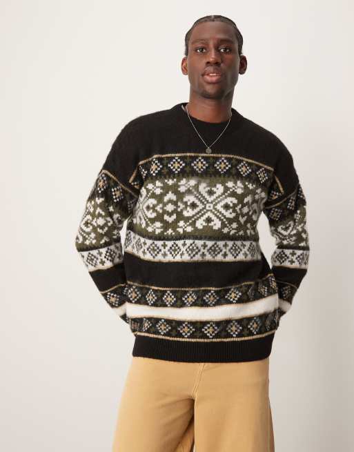 ASOS DESIGN relaxed fluffy knitted crew neck jumper with fairisle pattern in black