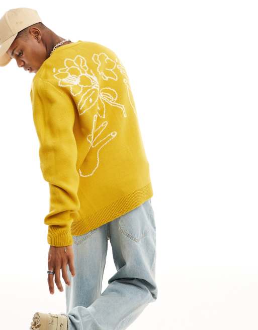 ASOS DESIGN relaxed knitted cardigan with floral back design in mustard