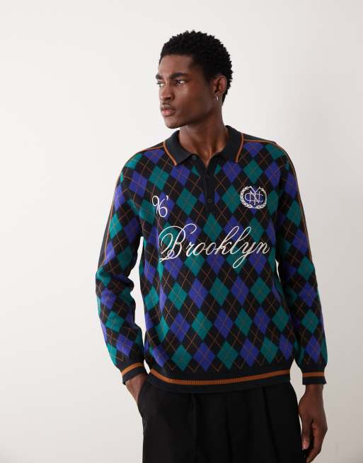ASOS DESIGN relaxed knitted co-ord argyle print polo with Brooklyn embroidery in blue and black - MULTI
