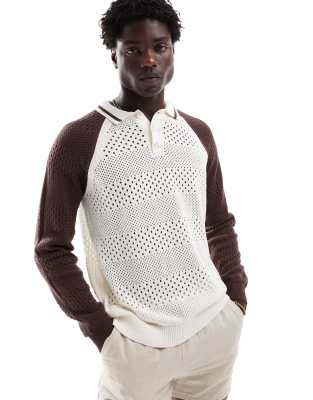 ASOS DESIGN relaxed knitted pointelle button through polo in ecru with brown contrast sleeves
